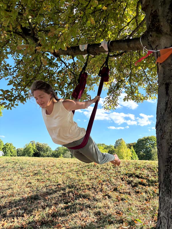Im Aerial Yoga eröffnet sich zusätzlich eine neue Dimension: das Schweben im Tuch schenkt dir Leichtigkeit, Vertrauen und die Möglichkeit, Altes loszulassen. Ob am Boden oder in der Luft – Yoga ist für mich ein Schlüssel, um wieder mehr zu spüren, in die Balance zu kommen und innere Ruhe zu finden.